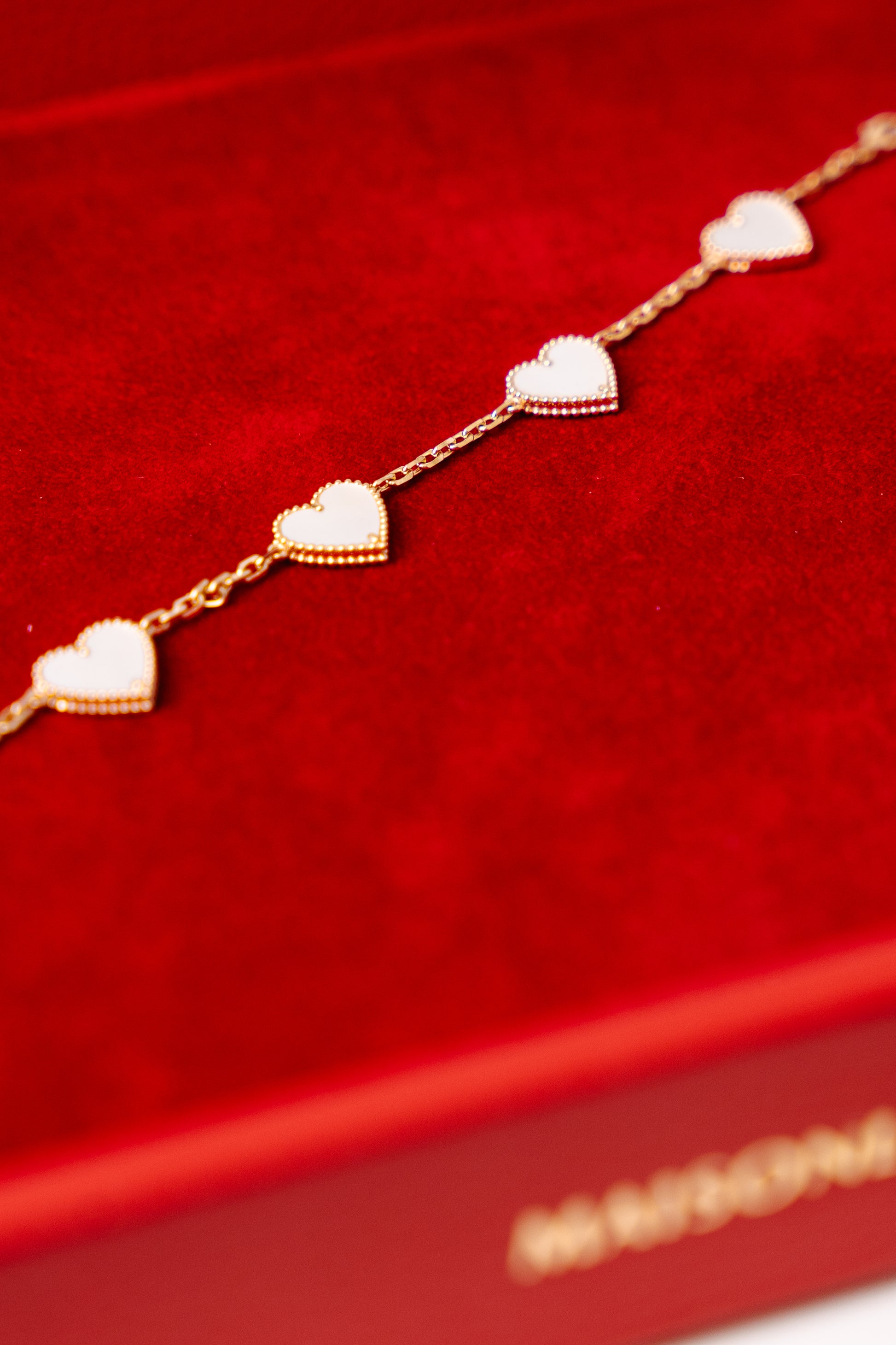 Dieses exklusive 18K Goldarmband mit filigranen weißen Achat-Herzen verbindet luxuriöse Eleganz mit modernem, femininem Design. Die herzförmigen Achat-Elemente sind sorgfältig eingefasst und harmonieren perfekt mit dem warmen Glanz des Echtgoldes.