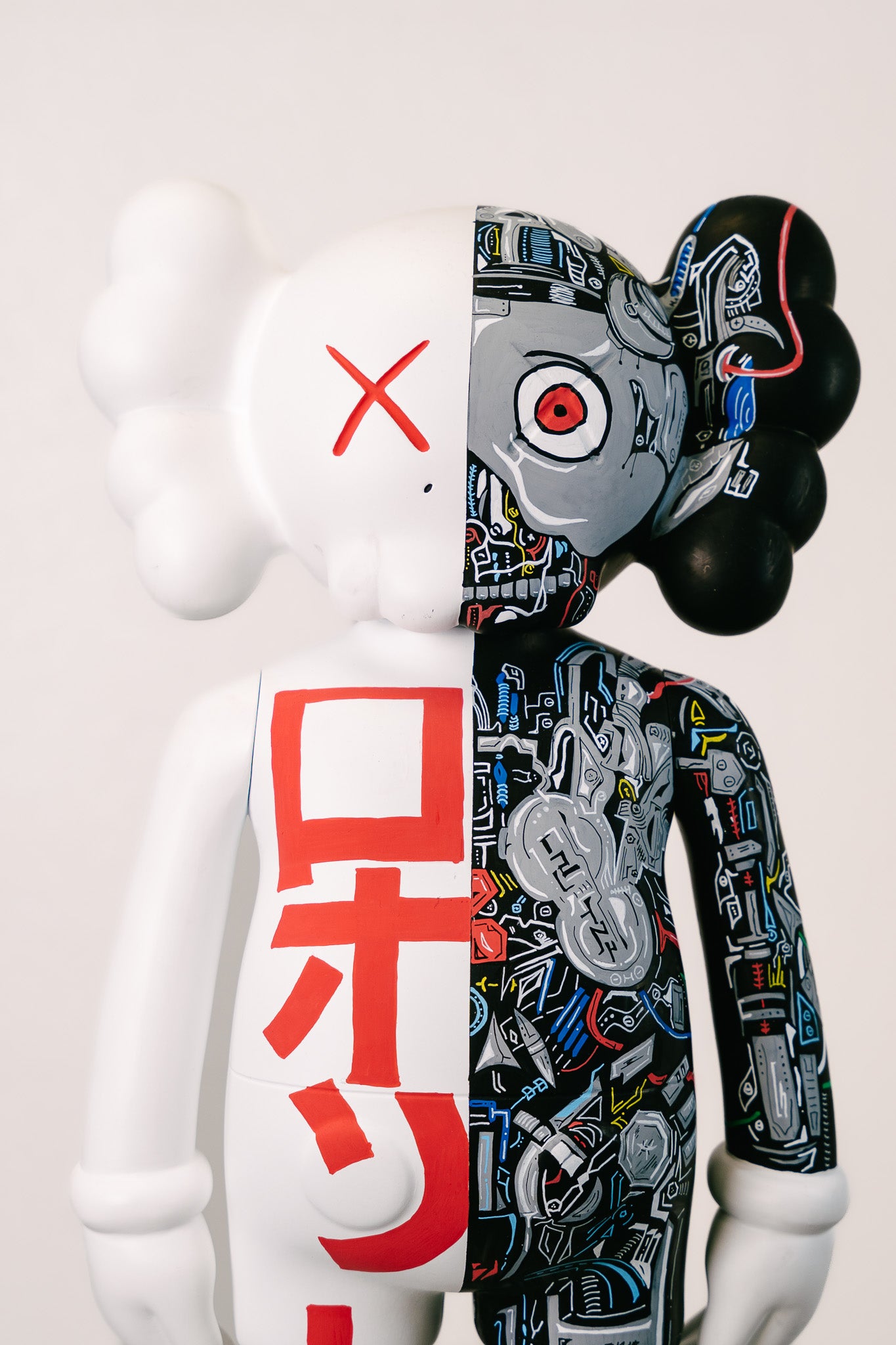 Die Clowny 70 cm – Japan Robot Edition kombiniert ein cleanes, japanisch inspiriertes Design mit einer detaillierten Roboter-Ästhetik, die moderne Kunst und mechanische Präzision perfekt vereint. Die Figur beeindruckt durch ihre Half-&-Half Gestaltung – eine Seite minimalistisch weiß mit markanten roten japanischen Schriftzeichen, die andere Seite ein komplexes, farbintensives Maschinen-Innenleben.