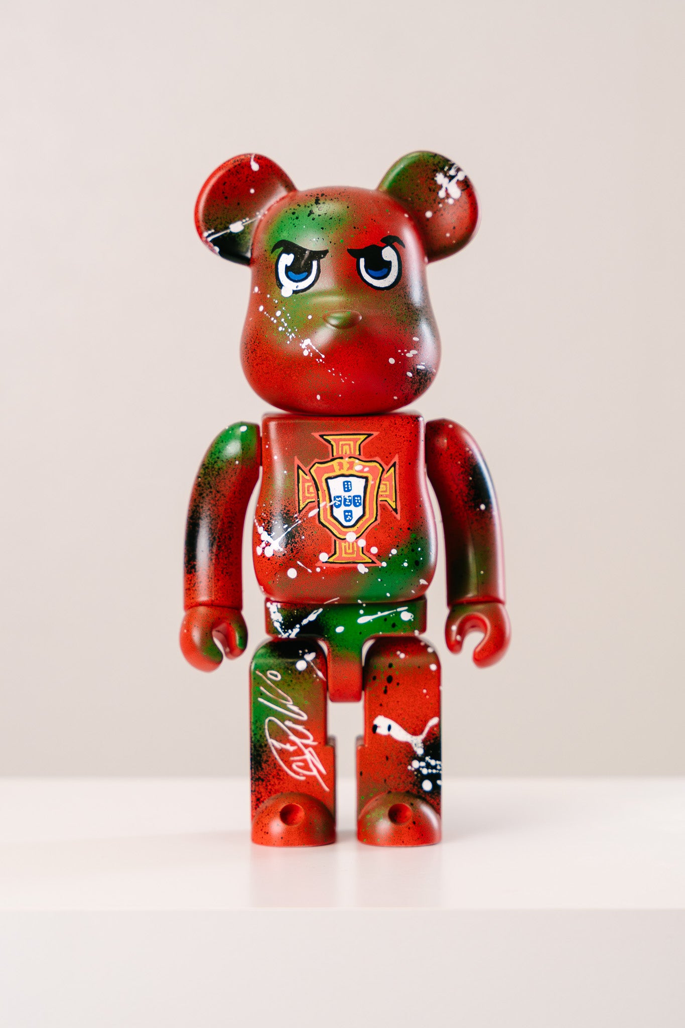 Dieser exklusive 28 cm Bearbrick wurde in aufwendiger Handarbeit im Stil des portugiesischen Wappens und der kraftvollen Landesfarben gestaltet. Die Kombination aus intensivem Rot-Grün, Airbrush-Effekten und ikonischen Symbolen macht diese Figur zu einem besonderen Highlight für Fans, Sammler und alle, die ihre Verbundenheit zu Portugal zeigen möchten.