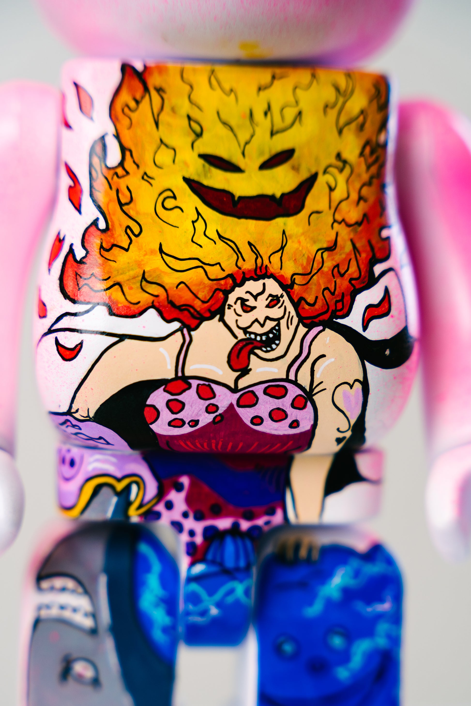 Mit intensiven Rot-, Gelb- und Blautönen, kombiniert mit lebendigem Shading und dynamischen Lichteffekten, wird dieser Bearbrick zu einem echten Blickfang in jeder Sammlung. Die pinke Grundfarbe des Körpers harmoniert ideal mit Big Moms ikonischem Outfit und unterstreicht gleichzeitig den künstlerischen Charakter der Figur.