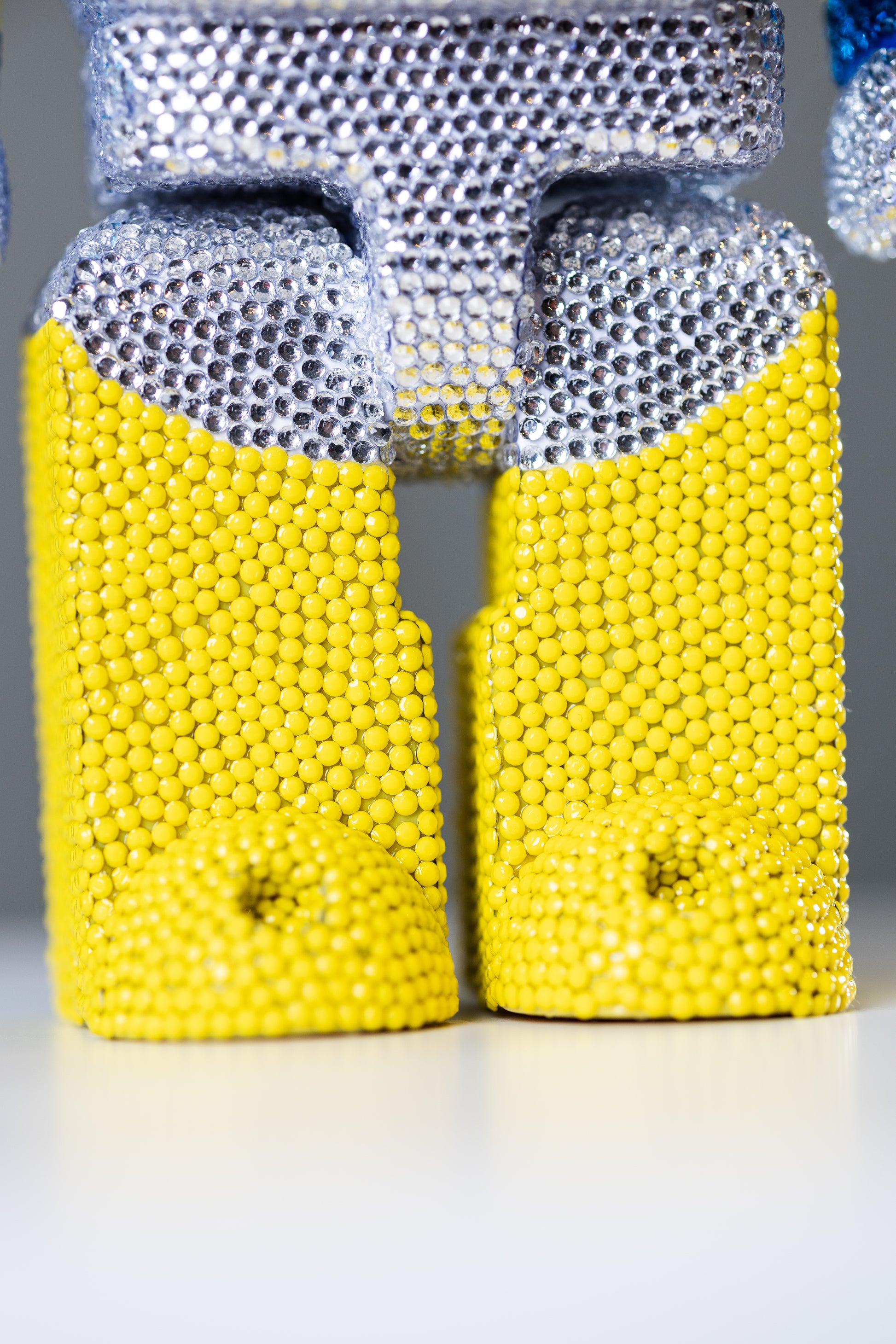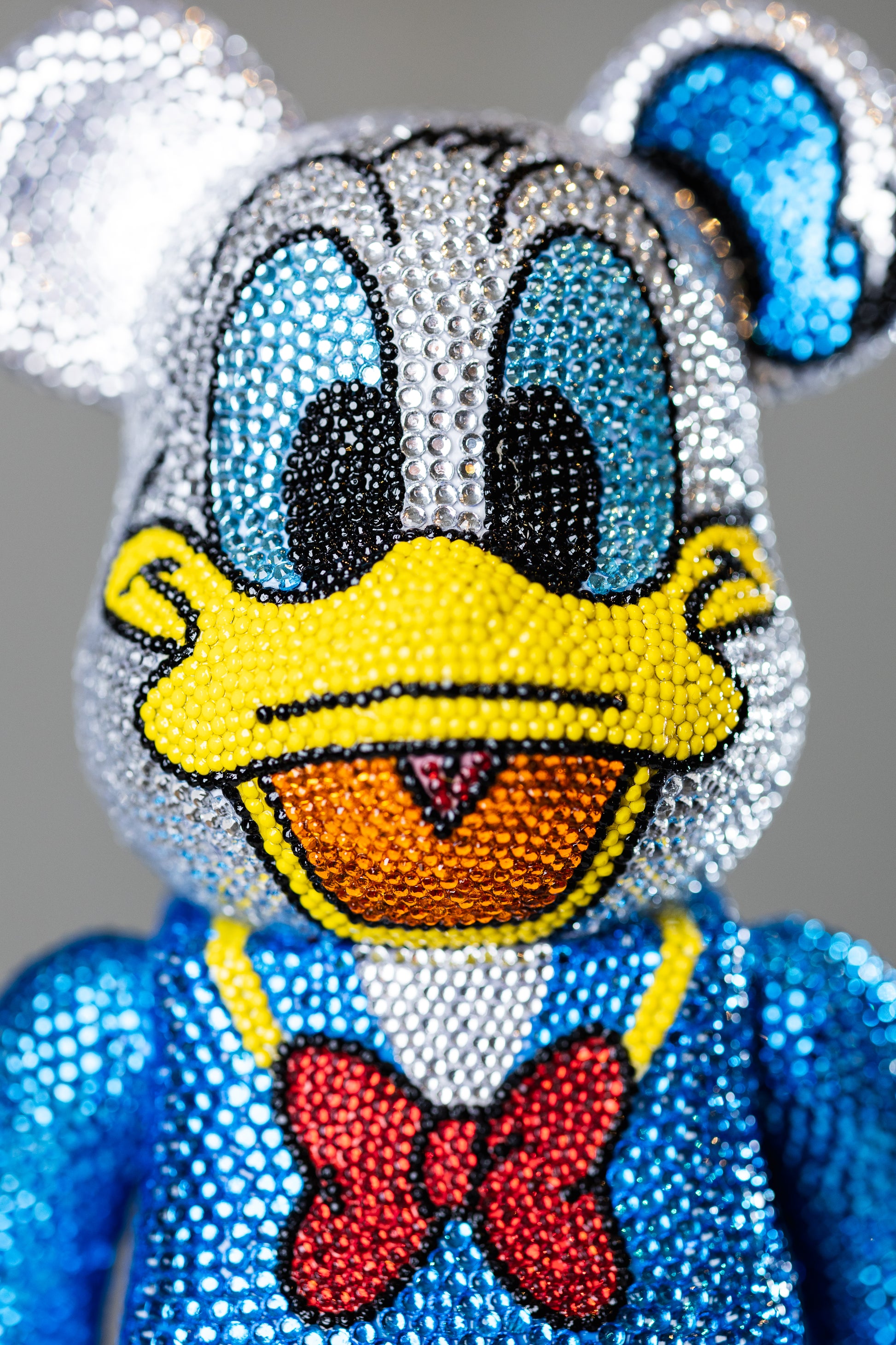 Dieser exklusive Bearbrick (28 cm) wurde in aufwendiger Handarbeit vollständig mit über 8.000 Strasssteinenveredelt. Das farbenstarke Donald Duck mit blauem Outfit, roter Schleife und gold-gelben Akzenten bringt Pop-Art und Luxus perfekt zusammen – ein echter Eyecatcher für Sammler und Interior-Fans.