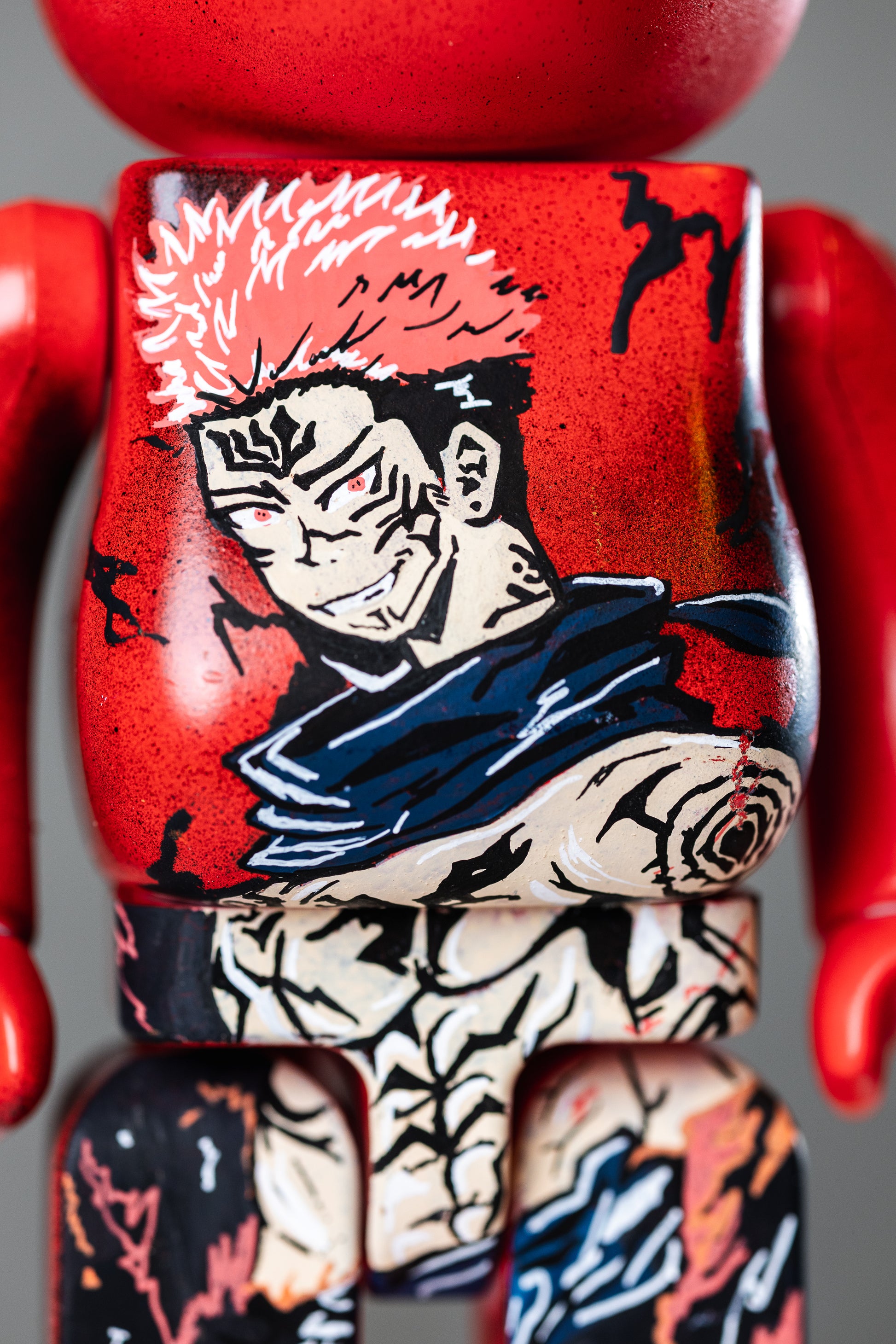 Dieser exklusive Bearbrick (28 cm) ist inspiriert von Ryomen Sukuna – dem „König der Flüche“ aus Jujutsu Kaisen. Mit seinem typischen bösen Grinsen, den markanten Fluch-Mustern und dem kraftvollen rot-schwarzen Design wird diese Figur zum Highlight jeder Anime-Sammlung.