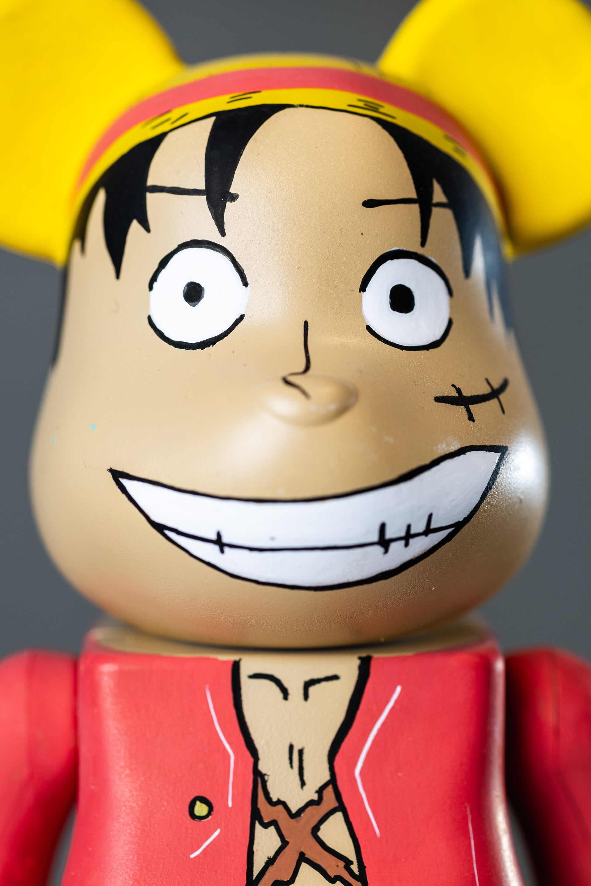 Dieser exklusive Bearbrick (28 cm) ist inspiriert von Monkey D. Ruffy (Luffy) – dem legendären Captain der Strohhutbande. Mit seinem typischen breiten Grinsen, der bekannten Narbe unter dem Auge und dem ikonischen Outfit in Rot-Blau-Gelb ist diese Figur ein absoluter Hingucker.