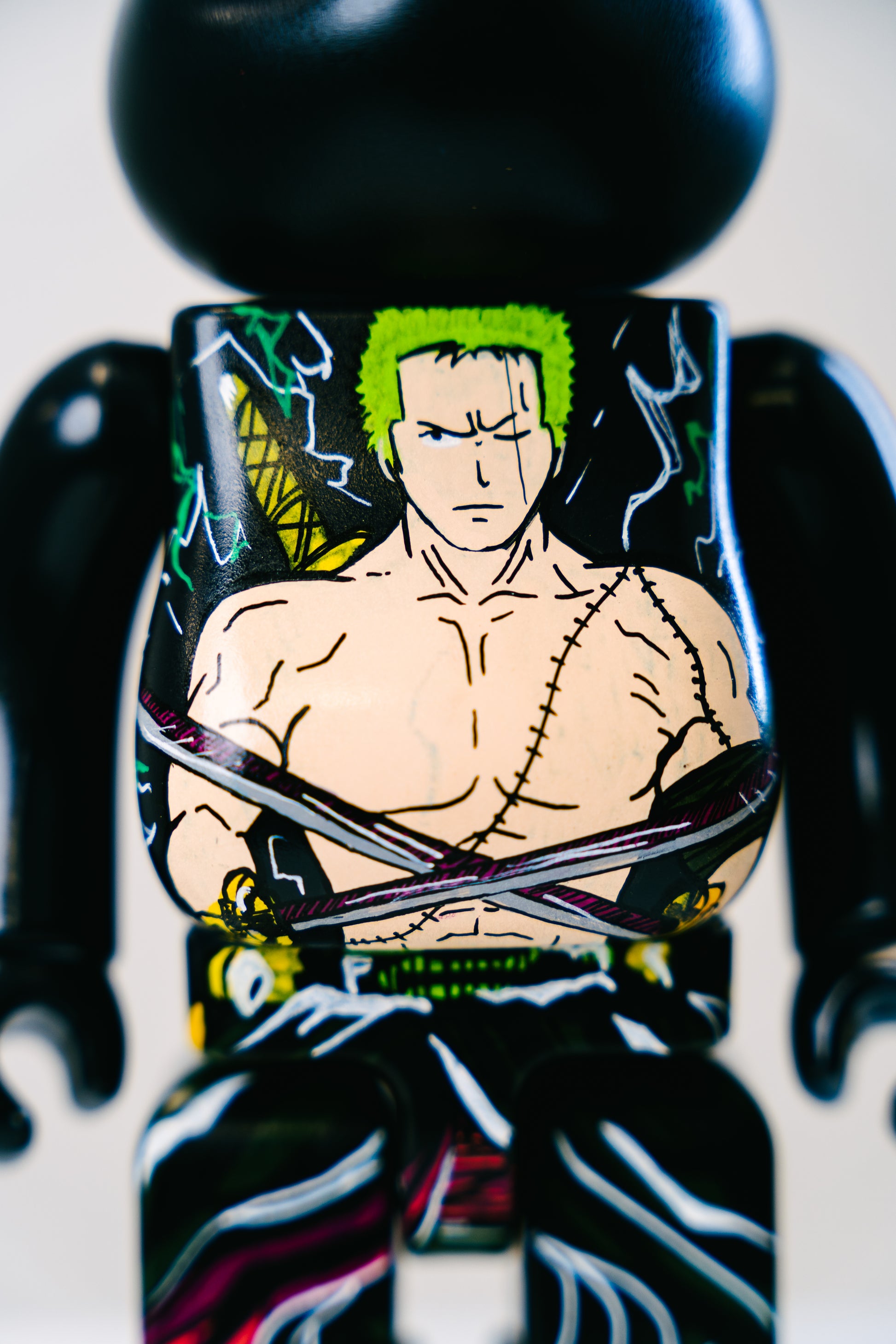 Diese eindrucksvolle Bearbrick 28 cm – Roronoa Zoro Edition ist ein absolutes Must-Have für jeden One Piece-Fan und Art-Toy-Sammler. Das hochwertige Artwork zeigt Roronoa Zoro, den legendären Schwertkämpfer der Strohhutpiraten, in seinem unverwechselbaren Look: grüne Haare, die ikonische Narbe über dem Auge, sein muskulöser Oberkörper und natürlich seine berühmte Drei-Schwerter-Technik.