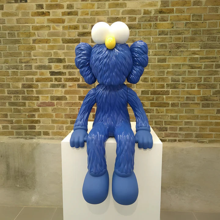 Diese besondere sitzende Clowny-Figur ist ein ausdrucksstarkes Kunst- und Designobjekt, das Ruhe, Charakter und zeitgenössische Pop-Art miteinander verbindet. Mit einer Gesamthöhe von 140 cm inklusive des Sockels / der Kiste, auf der die Figur sitzt, wirkt sie wie eine kuratierte Skulptur aus einer modernen Galerie oder einem Museum.